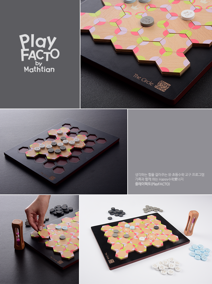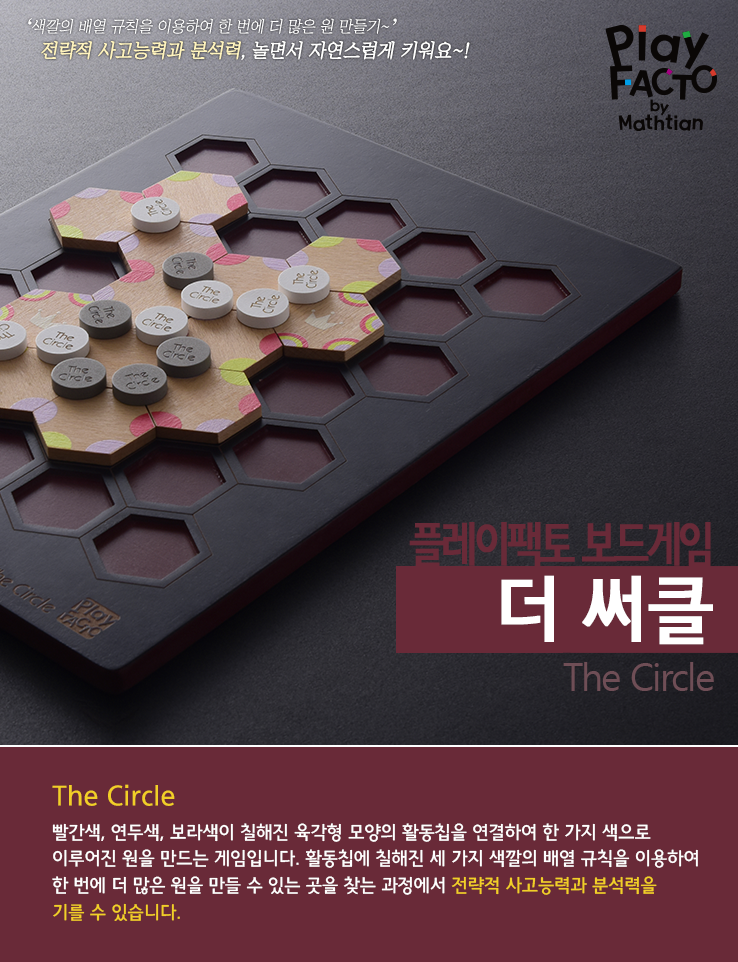 15 | The Circle (더 써클) 자세히보기(클릭!) | 5세 이상 | 빨간색, 연두색, 보라색이 칠해진 육각형 모양의 활동칩을 연결하여 한 가지 색으로 이루어진 원을 만드는 게임입니다. 활동칩에 칠해진 세 가지 색깔의 배열 규칙을 이용하여 한 번에 더 많은 원을 만들 수 있는 곳을 찾는 과정에서 전략적 사고능력과 분석력을 기를 수 있습니다. |