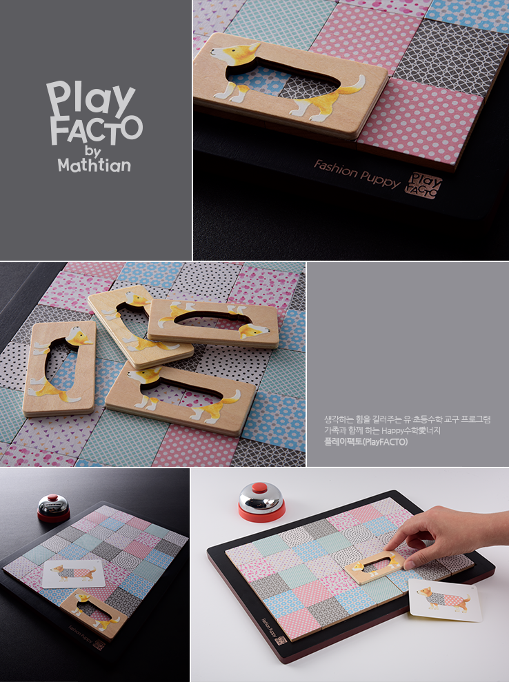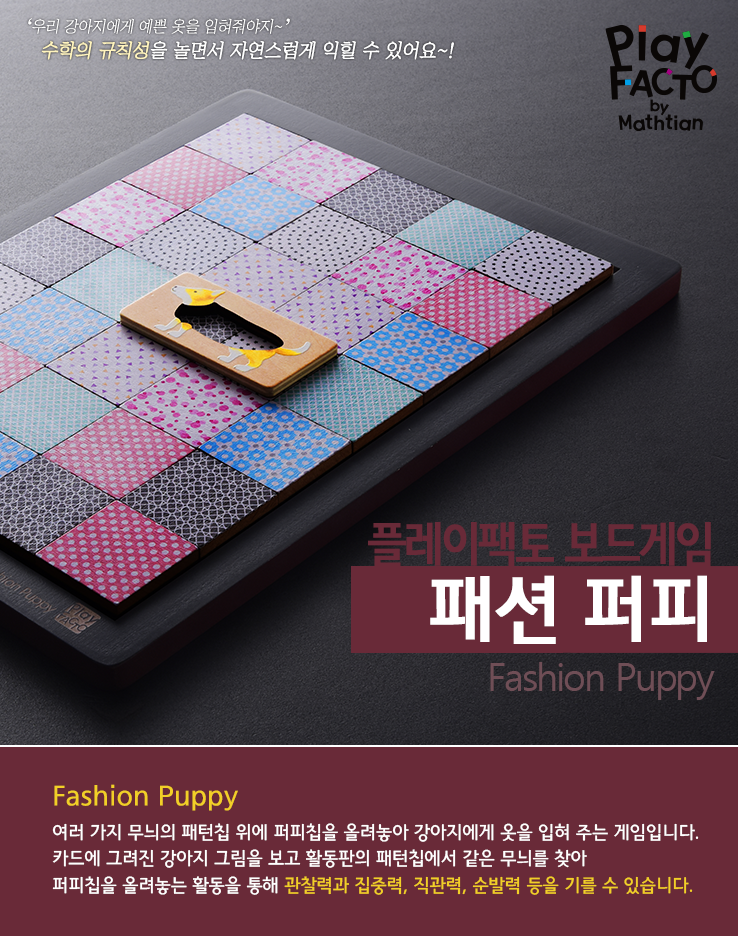 14 | Fashion Puppy (패션 퍼피) 자세히보기(클릭!) | 5세 이상 | 여러 가지 무늬의 패턴칩 위에 퍼피칩을 올려놓아 강아지에게 옷을 입혀 주는 게임입니다. 카드에 그려진 강아지 그림을 보고 활동판의 패턴칩에서 같은 무늬를 찾아 퍼피칩을 올려놓는 활동을 통해 관찰력과 집중력, 직관력, 순발력 등을 기를 수 있습니다. |